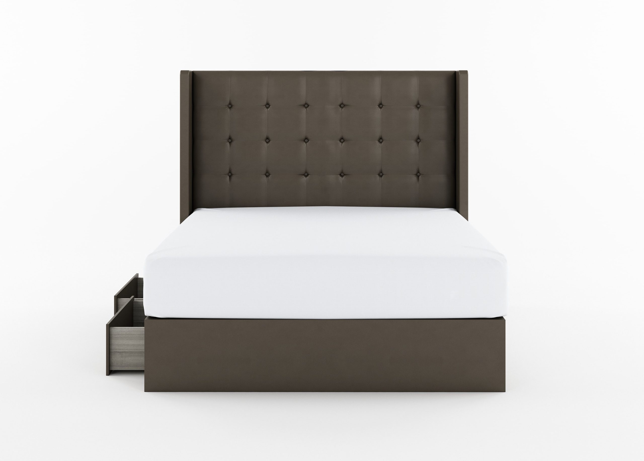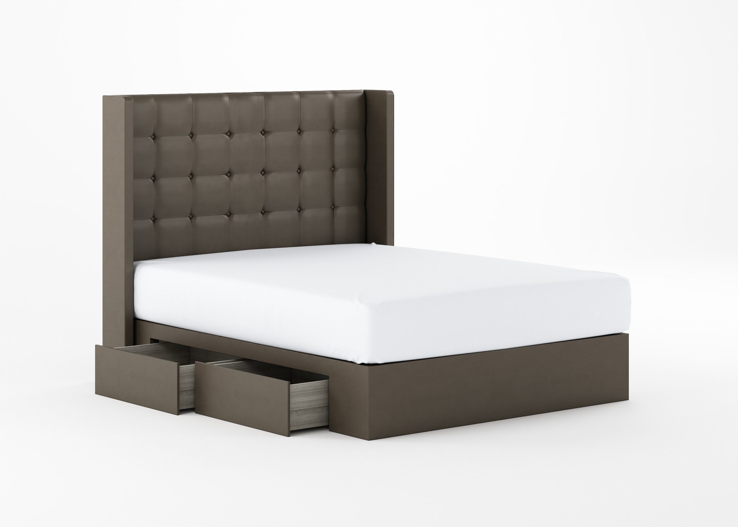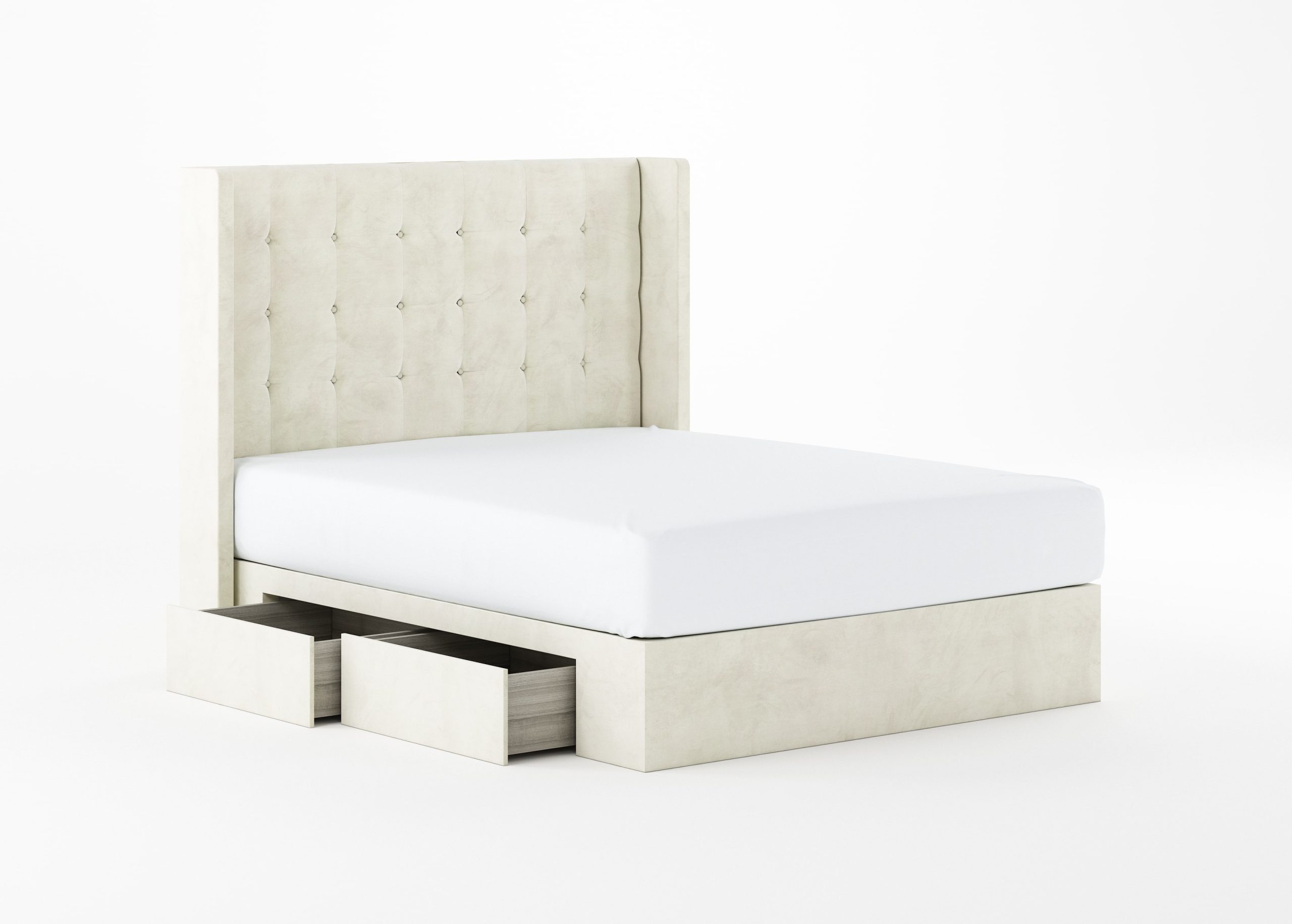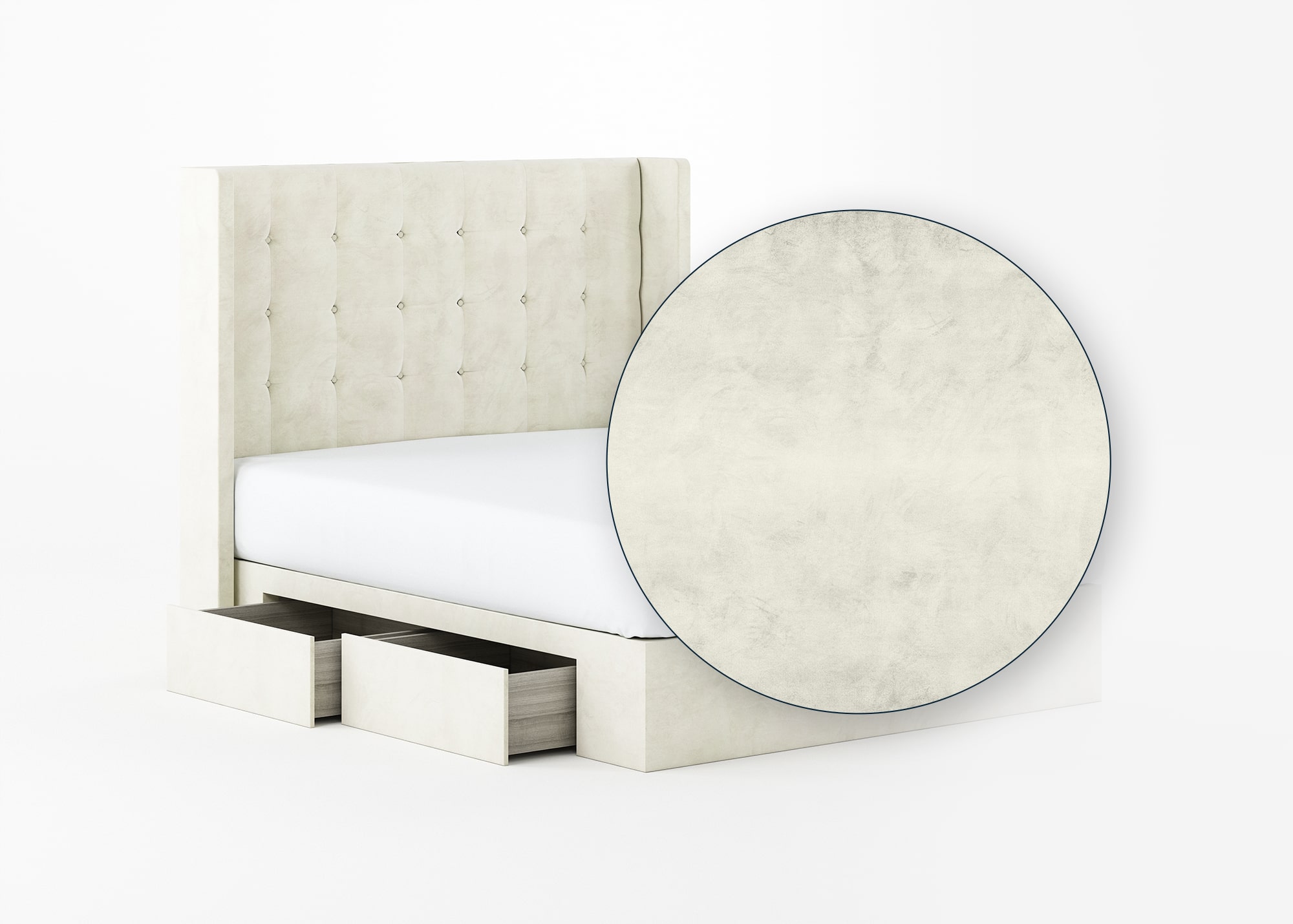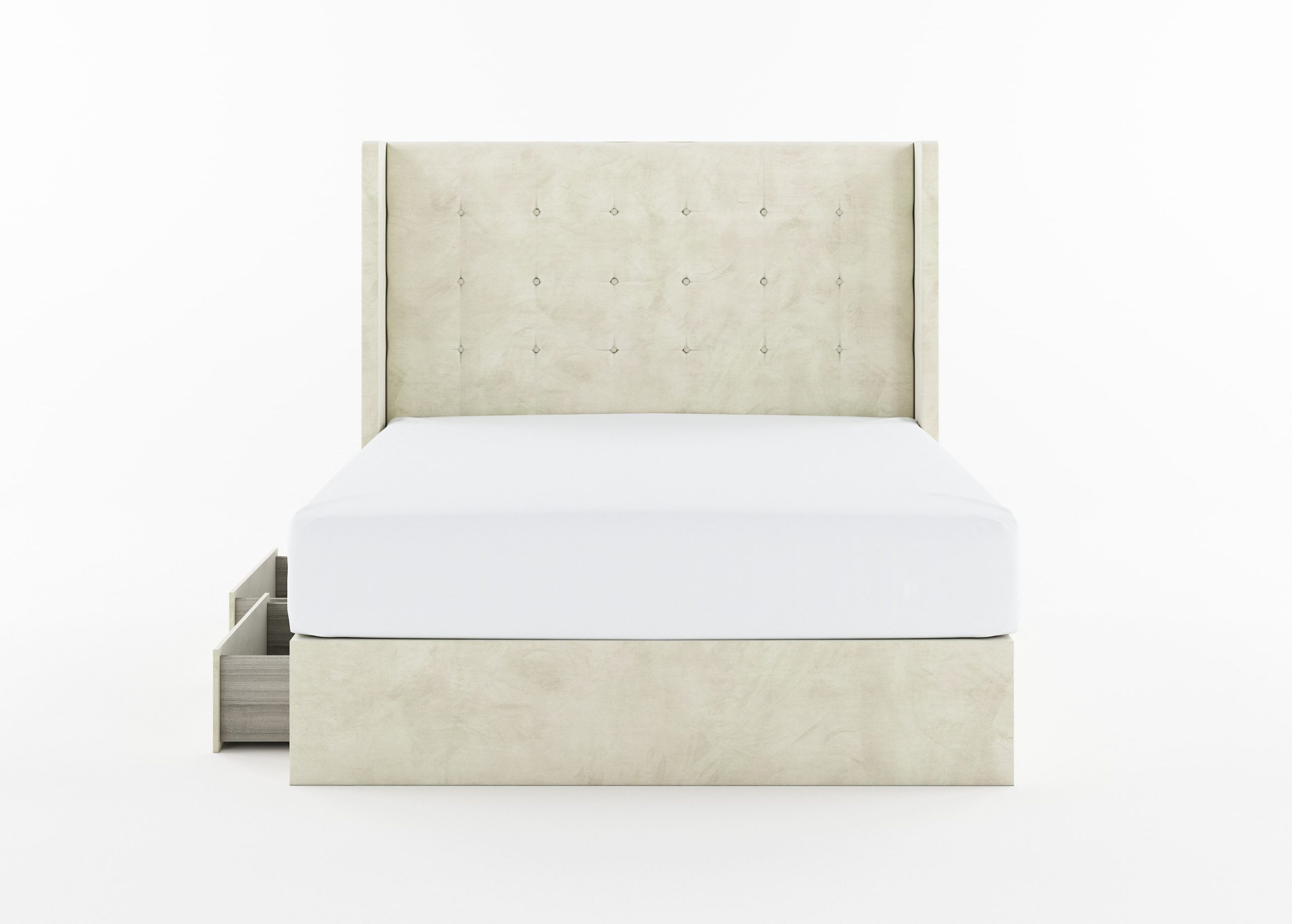Grid-tufted headboard in rocky or ivory.